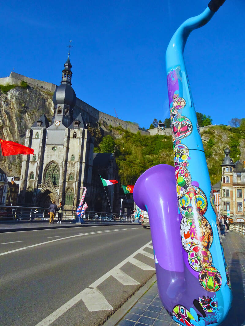 Esta ciudad está dividida en dos partes: la parte baja colindante al río, y la muralla que queda en lo alto. Cuando llegas a la ciudad te recibe un ambiente musical, y es que Dinant es la ciudad donde se creó el saxofón, instrumento que adorna el puente Charles de Gaulle, donde se pueden ver 28 saxofones decorados con motivos de diferentes partes del mundo. Además, se puede ver en una de las plazas, la estatua de Adolphe Sax, creador de este instrumento.