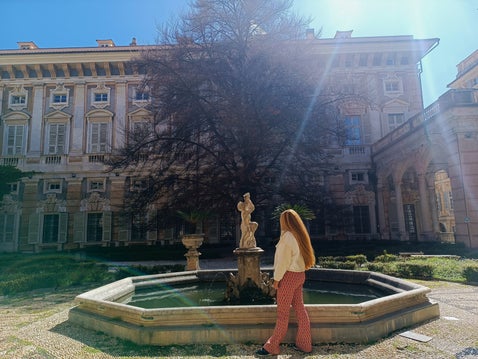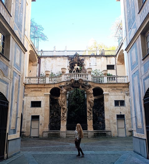 De la catedral fuimos callejeando hasta llegar a Via Garibaldi, donde se encuentran los grandes palacios de Génova. Como nos quedaba otro día de visita y ya era por la tarde-noche, decidimos ir a ver el Palazzo Lomellino, que tiene un jardín muy bonito, y nos sentamos en su café (Cambini Cafe) a tomar un Aperol Spritz, en una galería ajardinada encantadora.