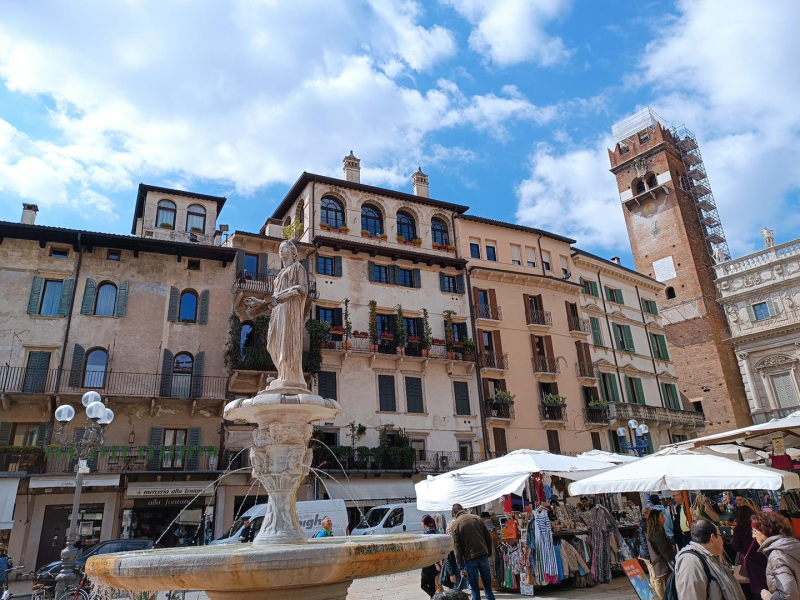 Originalmente fue el foro de la ciudad romana, el centro de la vida pública desde el siglo I a.C. Con los siglos, se transformó en mercado medieval, en sede comercial de la poderosa familia Scaligeri, y más tarde en centro administrativo bajo la República de Venecia. Aun hoy, la plaza conserva su alma mercantil: su nombre, “delle Erbe”, se remonta al antiguo mercado de hierbas y especias que se celebraba aquí desde el siglo XIV.